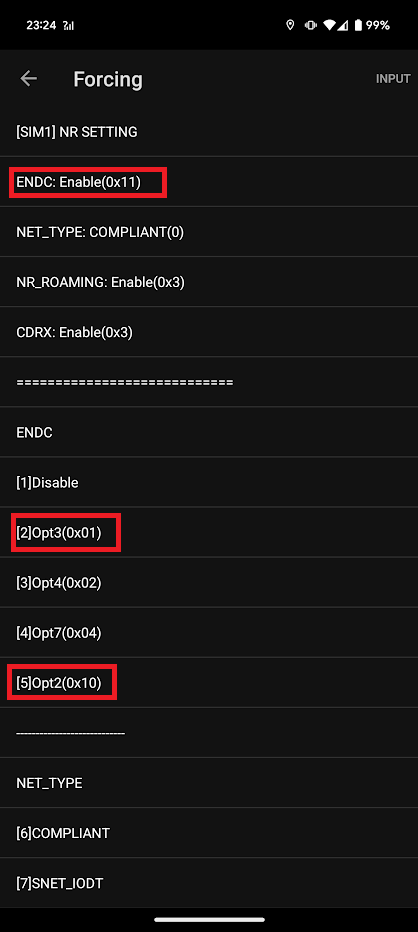 1. 手机已经解锁 Bootloader , 已经通过 Magisk / KernelSU Root 并取得 Root 权限 (参考图 1)2. 安装 网络信号大师 , 授权 Root 权限 , 确保可以看到网络详细信息 (参考图2)3. 点右上角三个点 – Forcing Control – 选择对应的 SIM 卡 (我的情况是SIM 1) (参考图3)4. 选择 NR SETTING (3) , 找到 ENDC , 点一次 Opt2(0x10) 和 一次 Opt3(0x01) , 确保上方的 ENDC 变成 ENDC: Enable(0x11) (参考图4)5. 重启手机